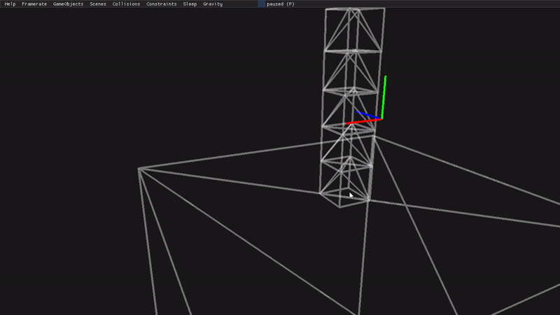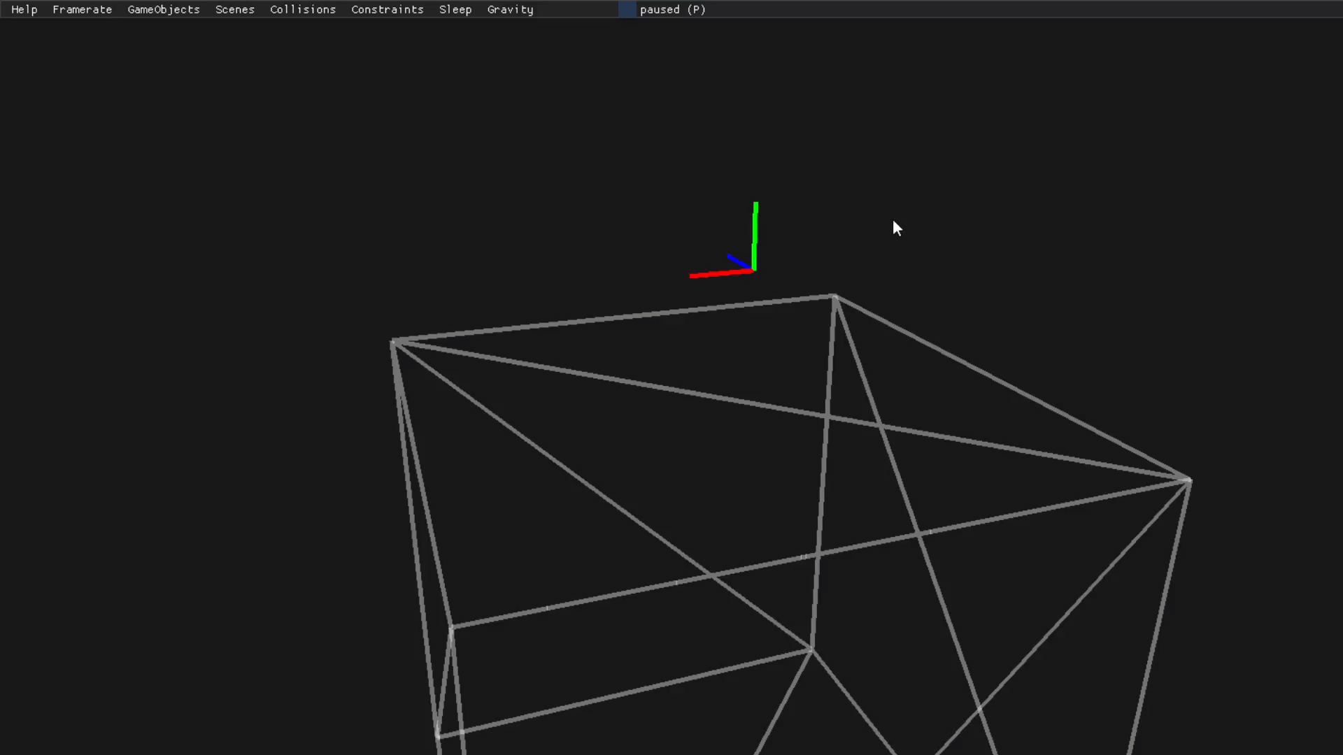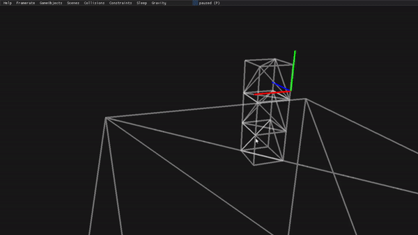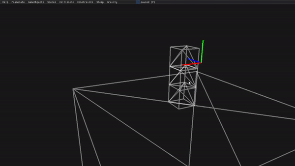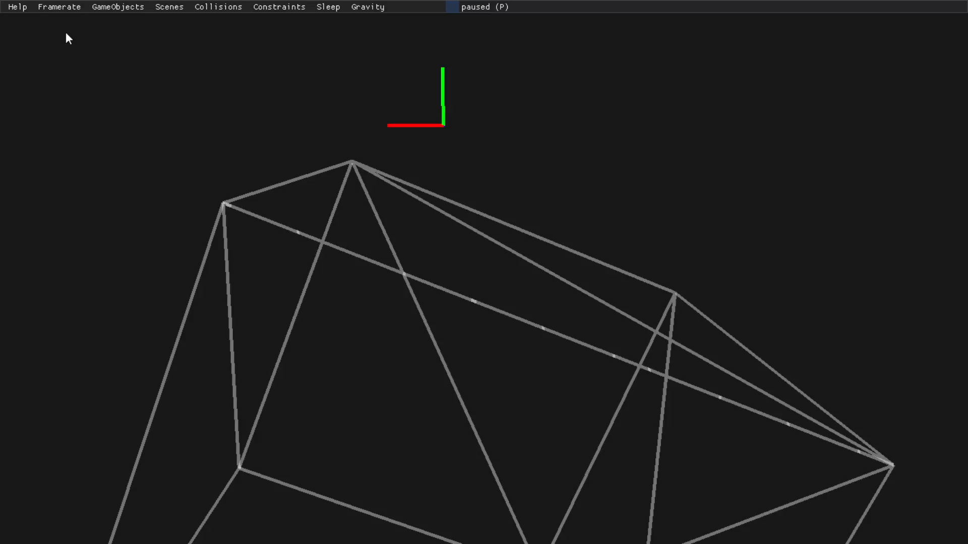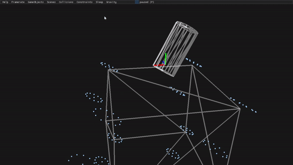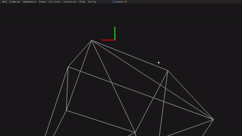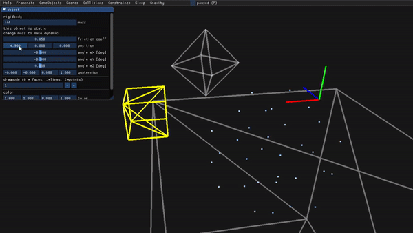 It features rigid body dynamics working for any convex shape. The integration uses the semi-implicit Euler method. The inertia tensor is computed from the geometry assuming the mass is evenly distributed throughout the volume. The collision detection can be done with both SAT and JGK. Both use half-edge meshes in order to optimize using hill-climbing. SAT also has contact generation. The collision resolution uses an iterative contact constraints solver.